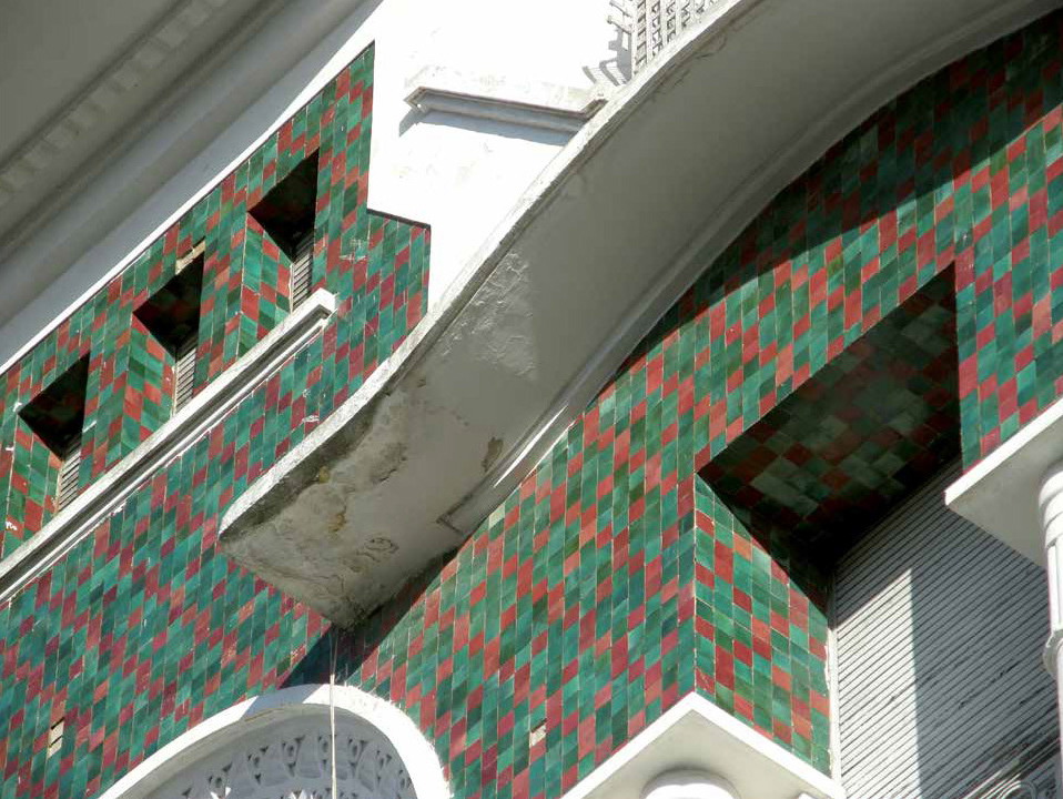 Détail de l’immeuble Glaoui, boulevard Mohammed-V, les carreaux polychromes de zellij remplacent ici les carreaux de faïence utilisés dans l’art-déco européen.