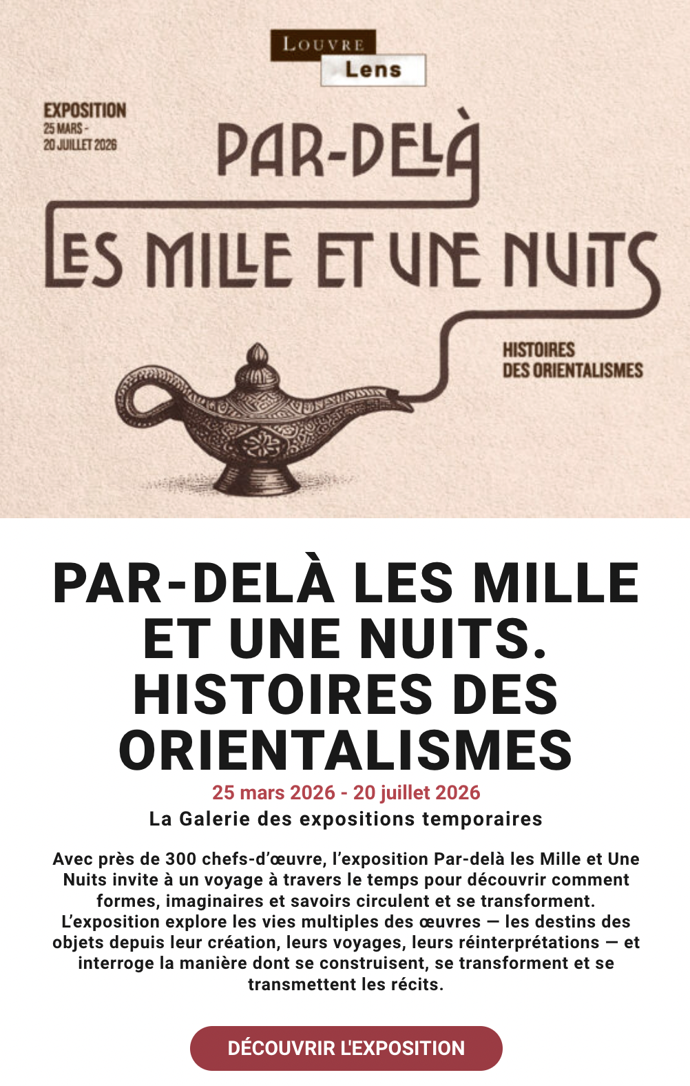 Dans un autre registre, l’artiste participe à l’exposition « Par-delà les mille et une nuits. Histoire des orientalismes », organisée au Louvre-Lens du 25 mars au 20 juillet 2026. Cette exposition propose une réflexion sur la manière dont l’Orient a été représenté à travers les siècles, en confrontant œuvres anciennes et contemporaines. Elle interroge les imaginaires, les représentations et les échanges culturels liés à cette thématique.